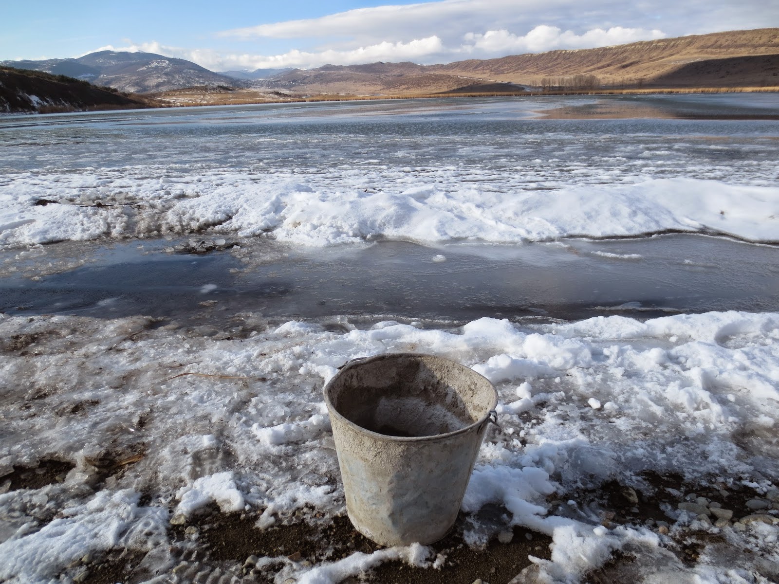 Bucket on the shore of a frozen Lisi Lake in Tbilisi
