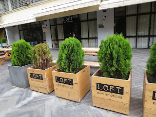 Picture of the front of a place called LOFT new american. It's a restaurant near Vake Park in Tbilisi.