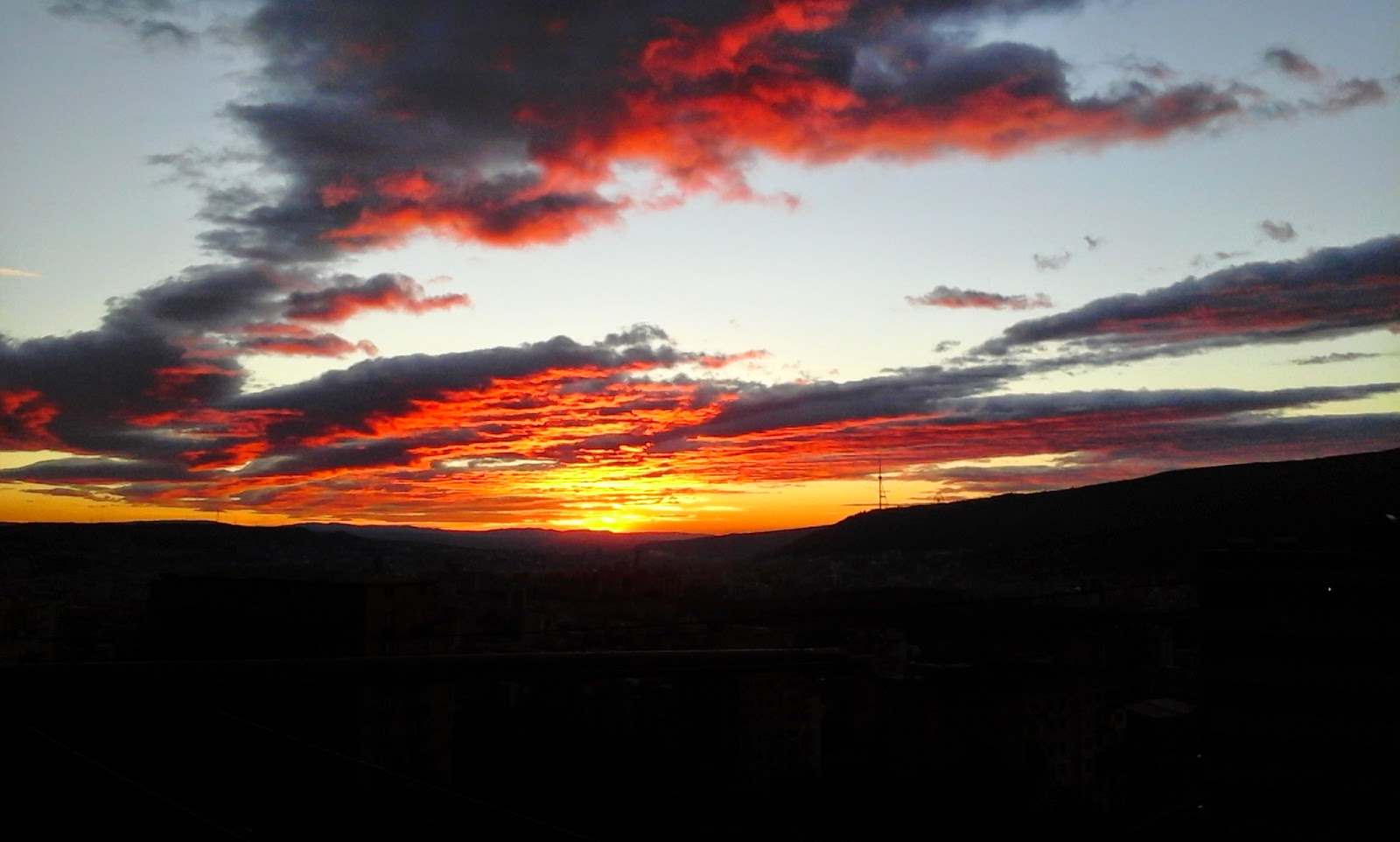 Cellphone picture of an early morning sunrise over the city of Tbilisi. The Tbilisi TV Broadcasting Tower is visible in the distance.